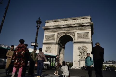 | Des touristes posent sur l'avenue des Champs Elysées, devant l'Arc de Triomphe, le 18 août, lendemain des attentats terroristes en Espagne. |