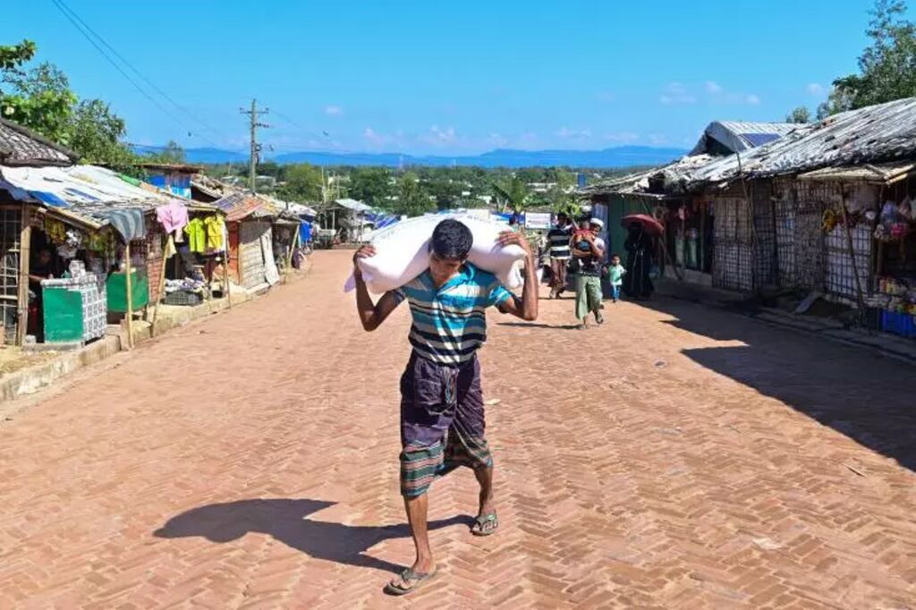 | Un réfugié rohingya transporte un sac d'aide alimentaire au camp de Kutupalong, le 23 novembre 2023 au Bangladesh. |