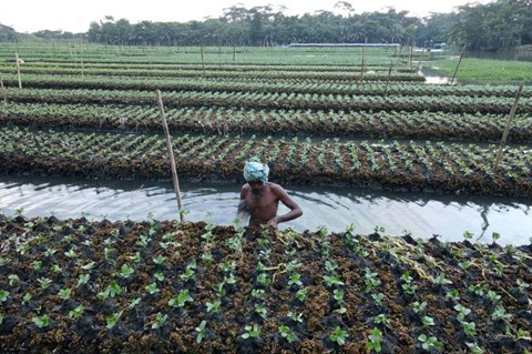 | Des légumes sont cultivés sur des potagers flottants, le 26 septembre à Mugarjhor, au Bangladesh. |