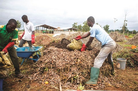 | Des employés du Centre pilote de gestion des ordures de la région de Toffo au Bénin. |