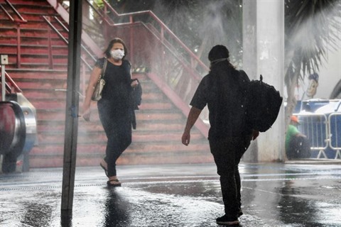 | Des personnes portant un masque de protection contre le coronavirus passent sous un pulvérisateur de désinfectant à l'entrée d'une gare, le 14 avril à Osasco, au Brésil. |