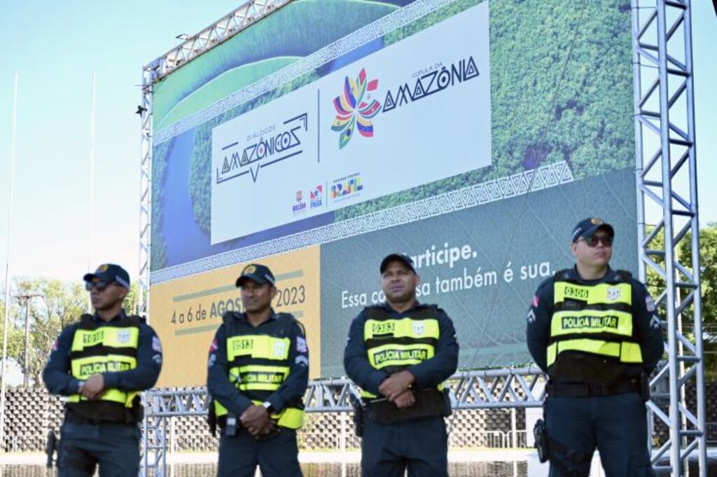 | Des policiers montent la garde au centre des congrès de Belém, au Brésil, avant le Sommet des pays d'Amazonie, le 6 août. |