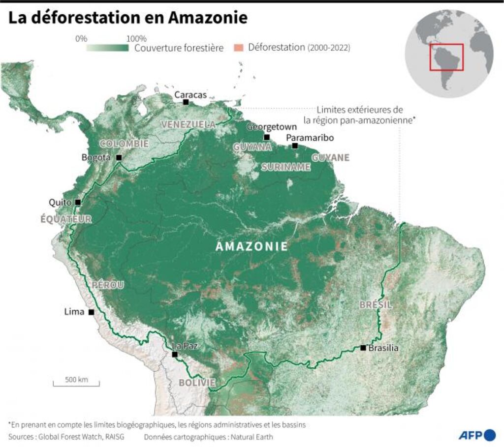 | Carte montrant la couverture forestière actuelle de l'Amazonie et la déforestation depuis 2000. Photo : AFP/VNA/CVN |