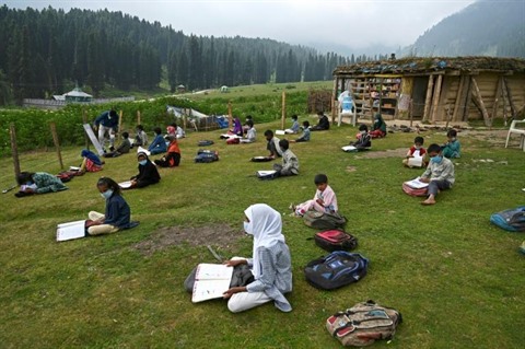 | Des élèves suivent un cours en plein air dans une prairie de Doodhpathri, au Cachemire indien, le 27 juillet. |