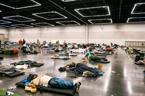| Des personnes se reposent dans un "centre de rafraîchissement" à Portland, dans l'État américain de l'Oregon, frappé comme Vancouver d'une intense vague de chaleur, ici le 28 juin. |