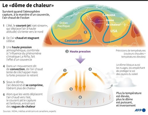 Cette vague de chaleur, à l'origine de plusieurs incendies de forêts de part et d'autre de la frontière canado-américaine, s'explique par un phénomène appelé "dôme de chaleur" : de hautes pressions emprisonnent l'air chaud dans la région.