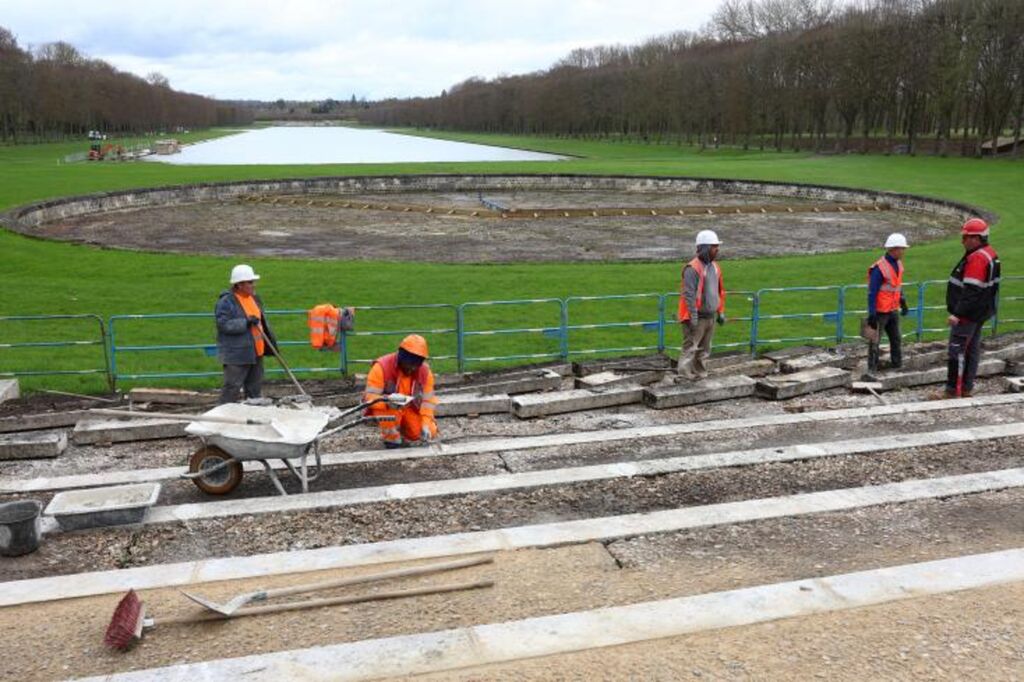 | Des ouvriers réalisent des marches sur le site d'une future infrastructure des Jeux olympiques et paralympiques de Paris 2024 au château de Versailles, le 29 mars. |