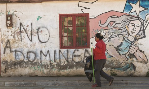 | Un graffiti contre le projet minier "Dominga" dans la ville chilienne de La Higuera. |