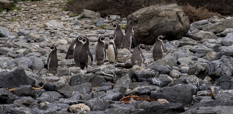 | Un groupe de manchots Humbolt (Spheniscus humboldti), une espèce menacée qui niche seulement au Chili et au Pérou, sur l’île Dama, à environ 500 km au nord de la capitale chilienne Santiago. |