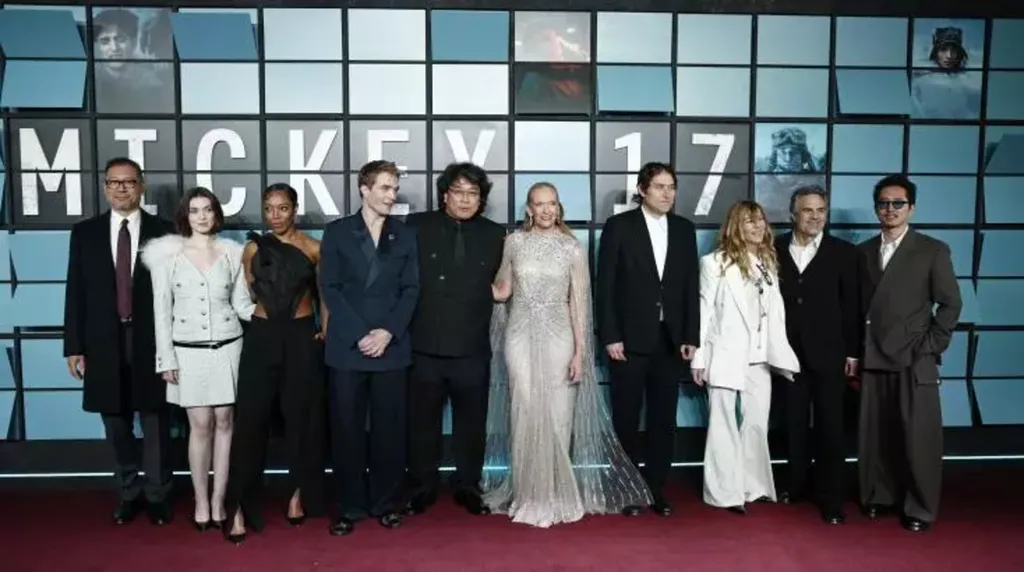 | L'équipe de "Mickey 17", dernier film du Sud-Coréen, Bong Joon Ho, lors de sa première mondiale à Londres, le 13 février. |