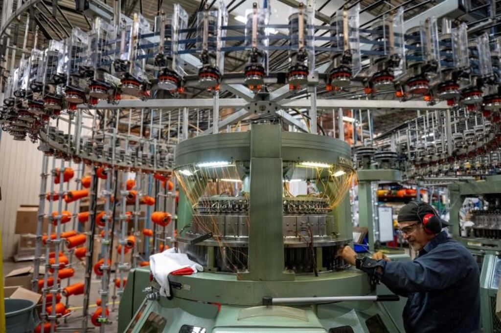 | L'immense machine à tricoter utilisée pour les maillots de hockey sur glace des équipes de NHL, à Sainte-Hyacinthe au Québec, le 27 septembre 2024. |