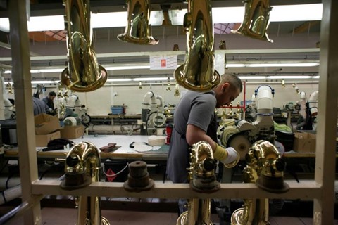 "Selmer a toujours été promené entre le côté modernité sur les outils et le côté un peu Amish : on garde la forge, la soudure et le polissage faits à la main", explique Eric Bruel, un ouvrier qui forme les pavillons des saxophones en faisant tourner les tubes de laiton sur un mandrin.