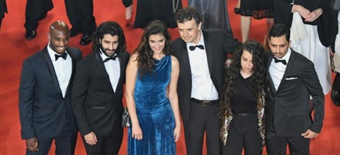 | De gauche à droite: Elis Gardiole, Mehdi Dahmane, Inas Chanti, Antoine Desrosieres, Souad Arsane et Sidi Mejai arrivent pour la projection de leur film "À Genoux les Gars" (Sextape), le 10 mai à Cannes. |