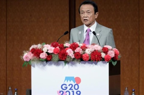 | Le ministre des Finances japonais Taro Aso, lors du G20, le 8 juin 2019 à Fukuoka (Japon). |