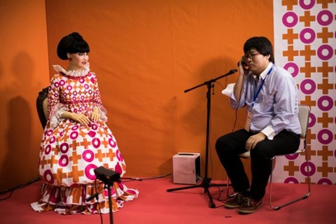 | Un homme parle avec le robot androïd "totto", réplique quasi parfaite de la star de la télé japonaise Tetsuko Kuroyanagi, au salon World Robot Summit, le 18 octobre à Tokyo. |