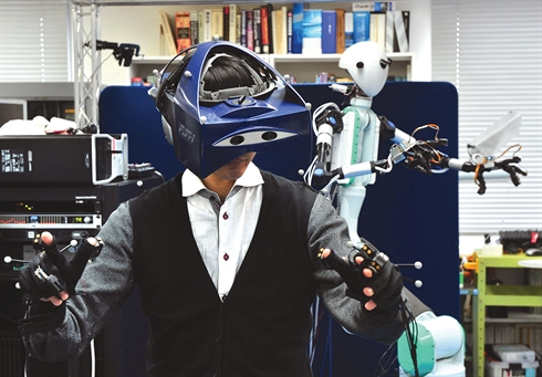 L’utilisateur de «Telesar V» est équipé d’un casque intégral, d’une veste et de gants spéciaux qui lui permettent non seulement d’actionner un robot androïde, mais aussi de voir, entendre et ressentir la même chose que la machine.