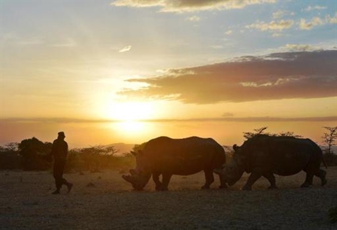 | Une rhinocéros blanche du Nord du Kenya et une congénère du Sud suivent un garde de la réserve d'Ol Pejeta, 290 km au Nord de Nairobi, le 27 janvier. |