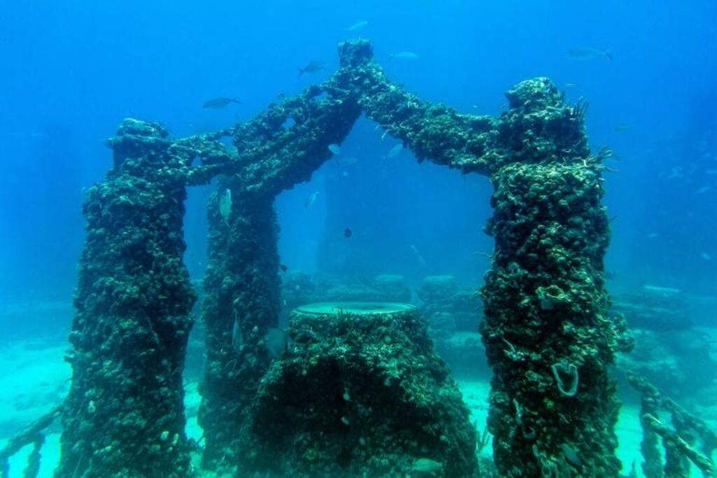 Une fois le fond marin atteint, ils tombent nez à nez avec les colonnes et les arcs d'un cimetière pour les amoureux de l'océan, un site qui regorge de vie aquatique. La construction du "Neptune Memorial Reef", situé à 5 km à l'est de Miami en Floride, a débuté en 2007.