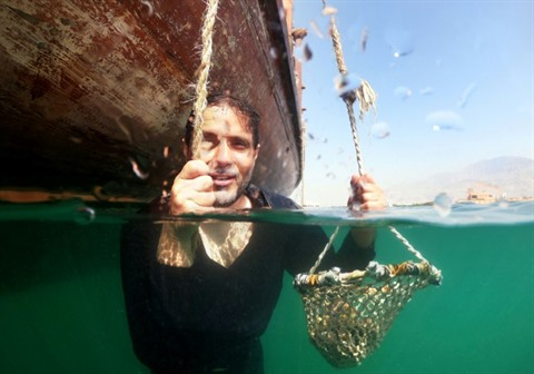 | Abdallah al-Souwaidi, qui possède une ferme perlière, montre comment ses ancêtres ramassaient les huîtres dans les fonds marins, près de Ras al-Khaimah, le 31 octobre 2019. |