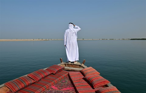 À bord d'un dhow, boutre traditionnel sur lequel les pêcheurs embarquaient des mois durant lors de la saison de la pêche aux perles, Abdallah Souwaidi troque sa robe blanche pour une combinaison de plongée noire.