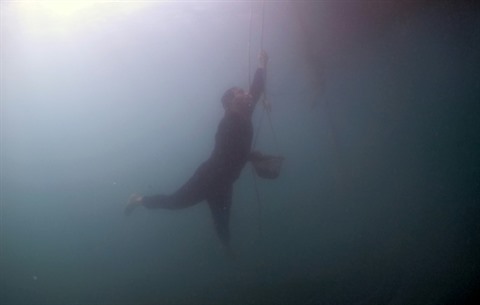 Ses outils sont simples : une pierre de lestage suspendue à son pied, un bouchon nasal et un panier.