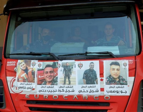 | Les portraits de pompiers tués dans l'explosion du 4 août à Beyrouth, affichés sur le camion de leur brigade, le 28 septembre. |