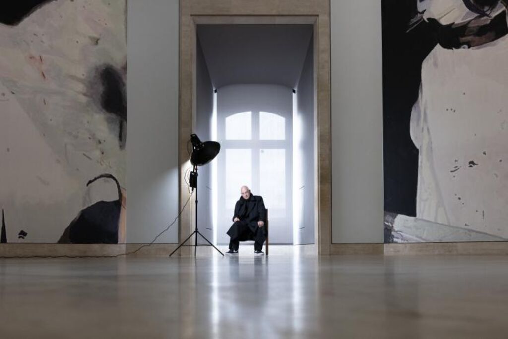 | L'artiste belge Luc Tuymans entre deux de ses créations au Louvre, le 21 mai, à Paris |