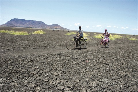 | Des personnes à vélo traversent une étendue asséchée du lac Chilwa. |