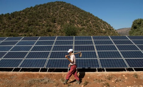 | Un agriculteur marocain passe devant un panneau solaire relié à un générateur alimentant une pompe à Tafoughalt, un petit village dans l'Est du Maroc, le 31 octobre. |