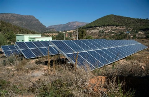| Vue générale des panneaux solaires reliés à des générateurs qui font remonter à la surface l'eau du sous-sol, installés à Tafoughalt, un petit village dans les montages marocaines, le 31 octobre. |