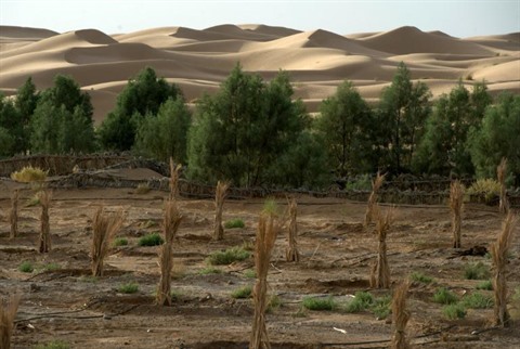 Depuis les années 1980, le sable ne cesse d'avancer sur la ville, dont les abords offrent un spectacle de désolation : à perte de vue, des centaines de palmiers pourrissent sur une terre ocre craquelée.