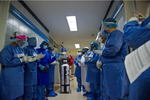 | Des personnels soignants applaudissent le petit robot Laluchy, le 27 août 2020 dans un hôpital de Mexique. |