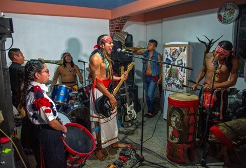 "En 2012 nous avons commencé à intégrer des prières comme le faisaient nos grands-parents aztèques et nous avons ajouté des instruments précolombiens pour créer quelque chose qui mélange notre présent et notre passé autochtone", explique à l'AFP Marco, le batteur, 33 ans.
