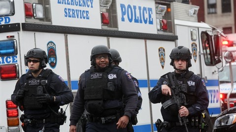 | La police est présente près de la scène de la fusillade dans une station de métro de l'arrondissement de Brooklyn, à New York. |