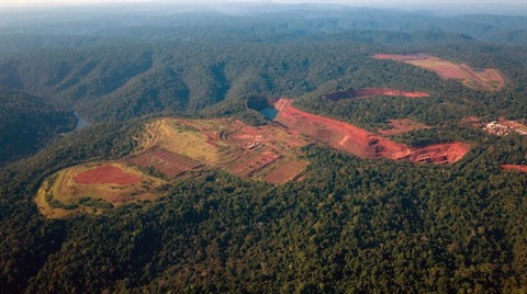 | Vue aérienne sur une mine à ciel ouvert appartenant au géant minier brésilien Vale dans l'État de Para, au Brésil. |