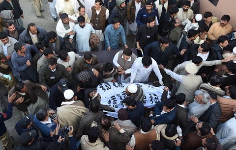 | Des hommes transportent une victime vers un hôpital de Mardan au Pakistan, le 29 décembre. |