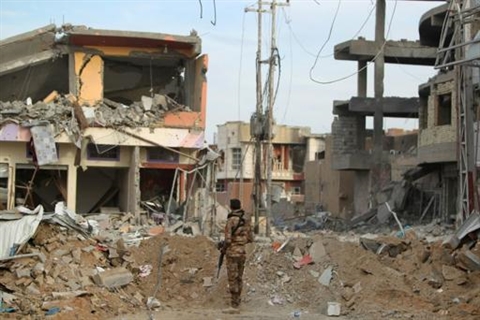 | Un membre des forces armées irakiennes se tient devant des bâtiments détruits, à Ramadi, à 110km à l'ouest de Baghdad, le 27 décembre. |