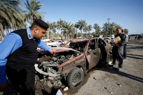 | Des membres des services de secours irakiens inspectent l'épave d'une voiture après un attentat, le 6 mars dans la ville de Hilla, au sud de Bagdad. |