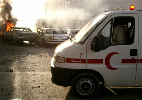 | Un ambulance arrive sur le lieu d'une explosion à Bagdad. |