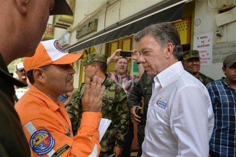 | Le président colombien Juan Manuel Santos s'entretient avec des secouristes après un glissement de terrain à Salgar en Colombie le 18 mai. |