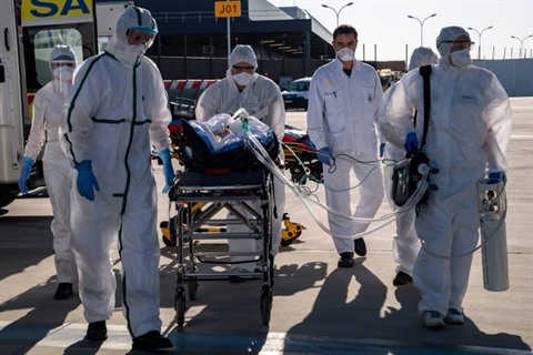 | Des personnels médicaux escortent un malade dans un avion militaire à l'aéroport parisien d'Orly, le 4 avril. |