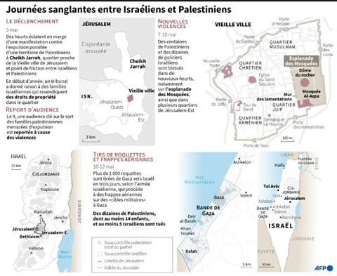 Des violences ont aussi gagné des villes israéliennes ces derniers jours, notamment Lod, cité mixte juive et arabe du Centre du pays, où l'état d'urgence a été décrété et un couvre-feu imposé de mercredi 12 mai à 20h00 à jeudi 13 mai à 04h00, après que la police a fait état d'émeutes par la minorité arabe.