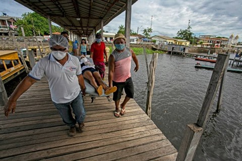 | Un patient présentant des symptômes du coronavirus est porté sur un brancard avant son transfert pour un hôpital par voie fluviale, à Melgaço (Brésil), le 10 juin. |