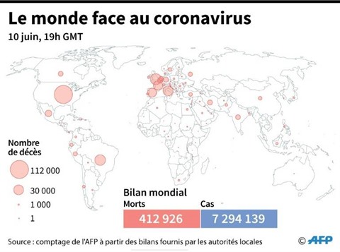 Dans le monde, le COVID-19 a fait plus de 414.000 morts, et infecté plus de 7,3 millions de personnes. Tous ces chiffres officiels sont sans doute inférieurs à la réalité, selon la communauté scientifique.