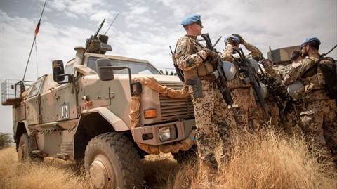 | Des membres des forces armées allemandes déployés dans un camp à Gao, dans la force de l'ONU au Mali (Minusma), en avril 2016. |