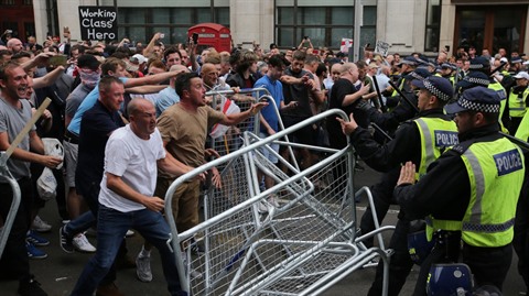 | Des partisans du fondateur de l'English Defence League Tommy Robinson font face à la police à Whitehall, Londres, Grande-Bretagne, le 9 juin. |