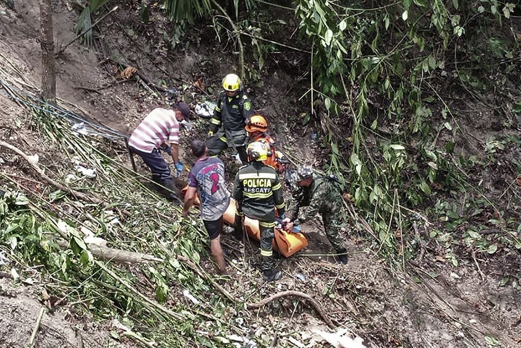 | Des secouristes et des policiers transportent des victimes dans un accident de bus à Santander, en Colombie. |