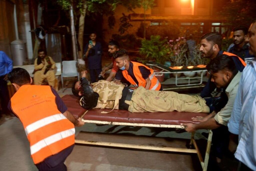 | Des secouristes transportent à l'hôpital un policier blessé dans une attaque contre complexe de police, le 17 février à Karachi, au Pakistan. |