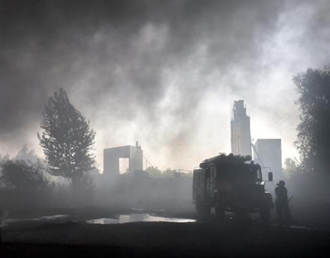 | Des pompiers ukrainiens combattent un gigantesque feu dans un dépôt pétrolier près de Kiev, le 9 juin. |