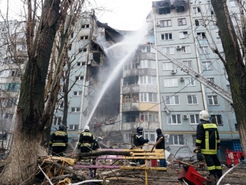 | Des pompiers combattent un feu après une explosion de gaz à Volgograd, dans le Sud de la Russie, le 20 décembre. |